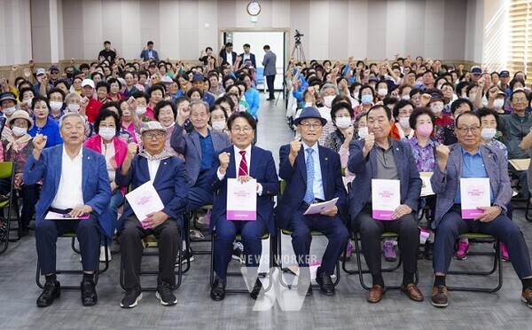 강기정 광주광역시장이 24일 오후 서구 광주노인회관에서 열린 ‘경로당지도자교육’에 광주다움 통합돌봄 등 시정 주요현안에 대한 정책간담회를 진행한 뒤 기념촬영을 하고 있다./광주광역시 제공