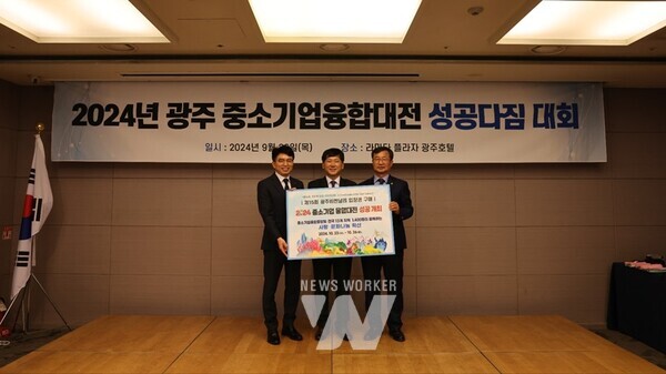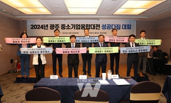 이상갑 광주광역시 문화경제부시장이 26일 오후 라마다플라자 광주호텔에서 열린 중소기업 융합대전 성공개최 다짐행사에 참석해 성공 개최를 위한 퍼포먼스를 보이고 있다.