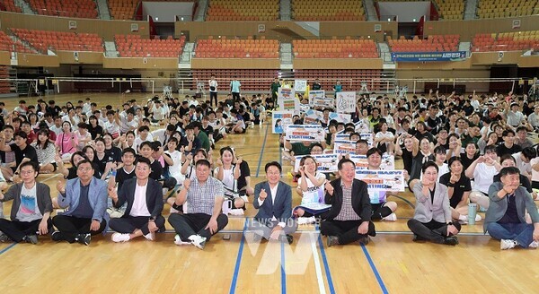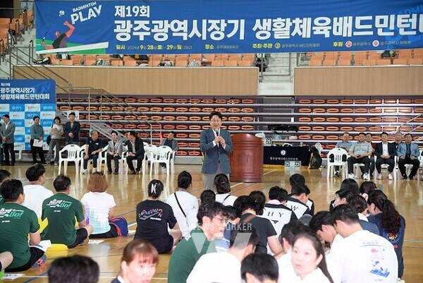 강기정 광주광역시장이 29일 오전 광주여대 시립유니버시아드체육관에서 열린 제19회 광주광역시장기 생활체육 배드민턴대회에 참석해 대회사를 한 후 참석자들과 함께 기념촬영을 하고 있다. /광주광역시 제공