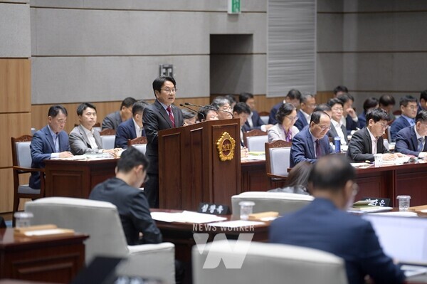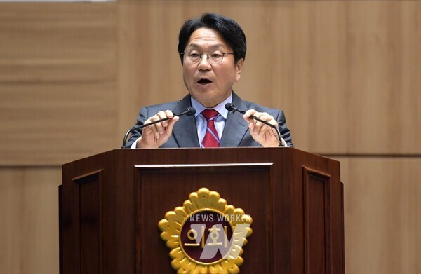 강기정 광주광역시장이 15일 오전 시의회 본회의장에서 열린 제328회 임시회 제3차 본회의에 참석해 시정질문에 대한 답변을 하고 있다. /광주광역시 제공