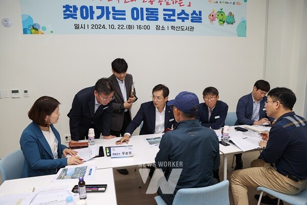 우승희 영암군수가 지난 22일 ‘찾아가는 이동 군수실’로 학산도서관을 찾아 ‘독천리 공용주차장 포장’ ‘학계리 진입로 가드 레일 설치’ 등 주민의견을 들었다.