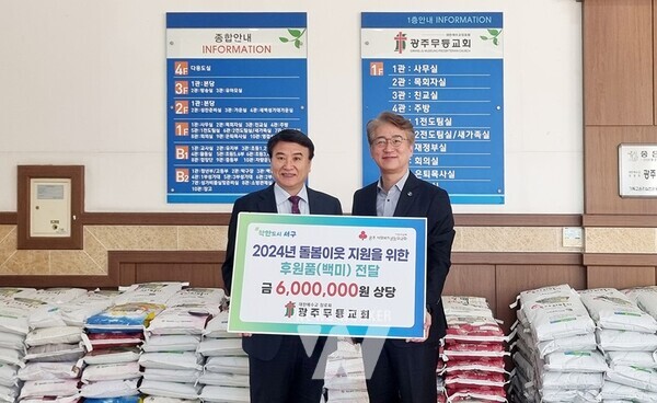 김이강 광주 서구청장은 31일 오전 무등교회(담임목사 오용선)로부터 관내 이웃돌봄이 필요한 주민에게 지원할 백미 200포(600만원)를 전달받고 감사의 마음을 전했다.