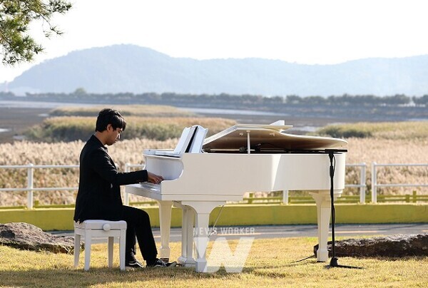 강진만 생태홍보관 앞마당에 피아노 포토존이 마련된 가운데 연주자의 피아노 선율에 갈대가 춤을 추고 있는 듯하다.