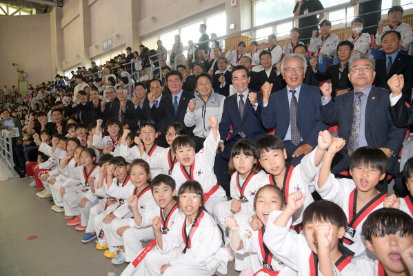 강기정 광주광역시장이 2일 오전 빛고을체육관에서 열린 2024년도 광주광역시장배 생활체육태권도대회에 참석해 선수단을 격려하고, 참석자들과 함께 기념촬영을 하고 있다. /광주광역시 제공