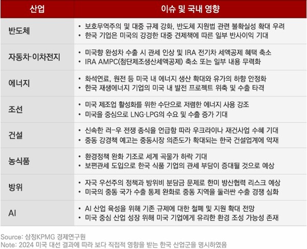 삼정KPMG, 트럼프 정책이 국내 산업에 미칠 영향 분석...韓 조선·건설 청신호 vs 반도체·자동차·이차전지는 타격 가능성
