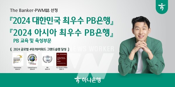 하나은행(은행장 이승열)은 글로벌 금융전문매체 더 뱅커(The Banker)와 PWM(Professional Wealth Management)이 공동 주최한 ‘제16회 글로벌 PB어워드(Global Private Banking Awards 2024)’에서 국가별 최고상인 "2024 대한민국 최우수 PB은행상(Best Private Bank in Korea)"을 수상했다고 밝혔다. 또한 하나은행은 이번 어워드의 ‘PB 교육 및 육성’ 부문에서도 "2024 아시아 최우수 PB은행상(Best Private Bank in Asia for Education And Training of Private Bankers)"을 수상했다.