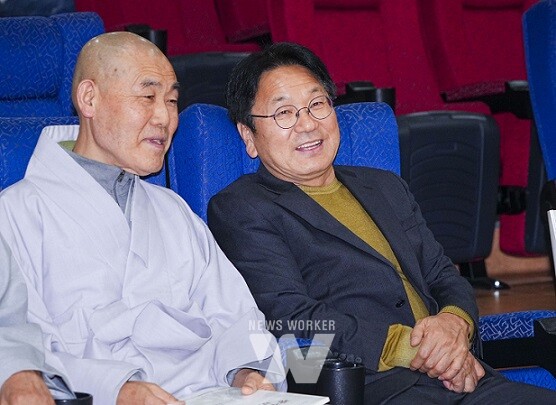 강기정 광주광역시장이 8일 오후 시청 무등홀에서 광주불교연합회 주최로 열린 ‘광주불교 유산의 보존과 활용’ 학술세미나에 참석해 월인 스님과(법륜사 주지) 대화하고 있다.