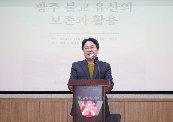 강기정 광주광역시장이 8일 오후 시청 무등홀에서 광주불교연합회 주최로 열린 ‘광주불교 유산의 보존과 활용’ 학술세미나에 참석해 축사를 하고 있다.공