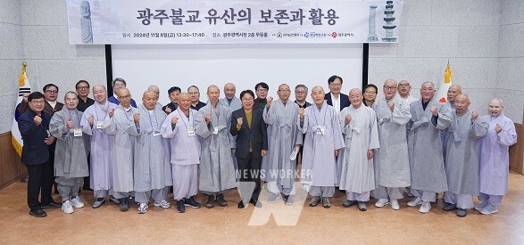 강기정 광주광역시장이 8일 오후 시청 무등홀에서 광주불교연합회 주최로 열린 ‘광주불교 유산의 보존과 활용’ 학술세미나에 참석해 광주불교연합회장 소운 스님, 신도 및 관계자들과 기념촬영을 하고 있다./광주광역시 제공