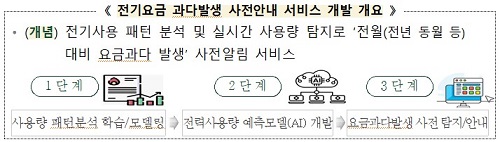 한국전력(대표이사 사장 김동철, 이하 한전)은 인공지능(AI) 기술을 활용해 전기요금 패턴을 분석하고, 요금급등 위험을 사전에 예측․안내하는 서비스를 개발하여 12월부터 시범서비스를 시행한다.