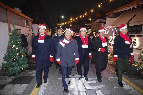 강기정 광주광역시장이 2일 오후 남구 양림오거리에서 열린 2024년 양림&크리스마스 문화축제 성탄트리 점화식에 참석해 행사를 마친 뒤 내빈들과 선교역사 순례길을 행진하고 있다.