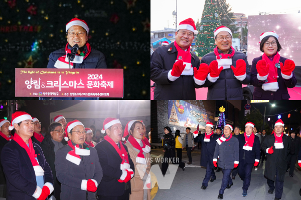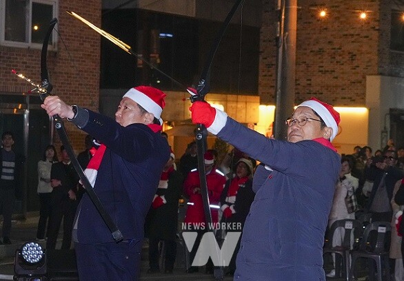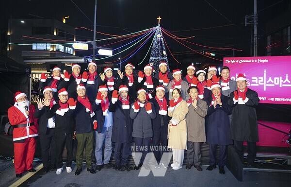 강기정 광주광역시장이 2일 오후 남구 양림오거리에서 열린 2024년 양림&크리스마스 문화축제 성탄트리 점화식에 참석해 김병내 남구청장 등과 트리 점화를 하고 있다.