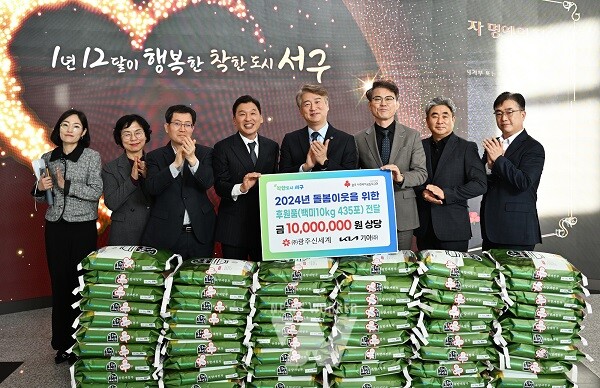 김이강 광주 서구청장은 10일 기아 광주전남지역본부(본부장 정길수)와 광주신세계(대표 이동훈)로부터 장애인 보호 시설 지원을 위한 백미10kg 434포(1천만 원 상당)를 전달받고 감사의 마음을 전했다.