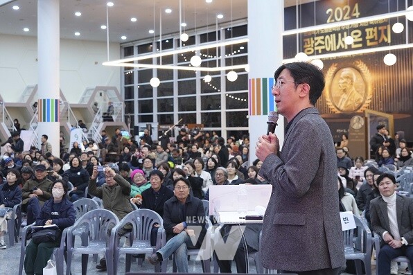 문학평론가 신형철 서울대 교수가 10일 저녁 광주광역시청 시민홀에서 열린 '한강 작가 노벨문학상 수상기념 시민 축하행사'에서 '한강의 작품세계'를 주제로 특강을 하고 있다.