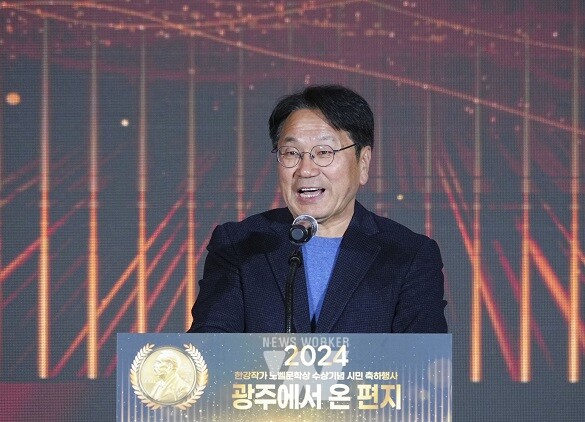 강기정 광주광역시장이 10일 저녁 광주광역시청 시민홀에서 열린 '한강 작가 노벨문학상 수상기념 시민 축하행사'에 참석해 환영사를 하고 있다.