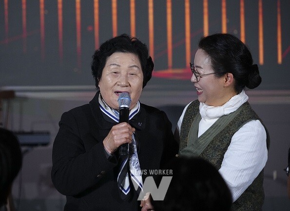 한강 작가 노벨문학상 수상기념 시민 축하행사가 10일 저녁 광주광역시청 시민홀에서 열린 가운데 '소년이 온다'의 주인공 '동호'의 모티브가 된 문재학 열사의 어머니 김길자씨가 인사말을 하고 있다.