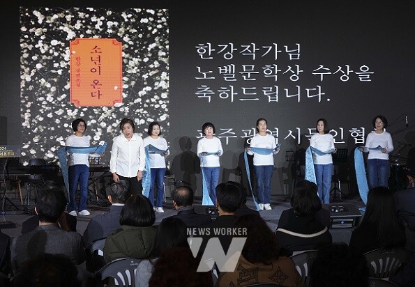한강 작가 노벨문학상 수상기념 시민 축하행사가 10일 저녁 광주광역시청 시민홀에서 열린 가운데 광주문인협회 회원들이 공연을 하고 있다./광주광역시 제공
