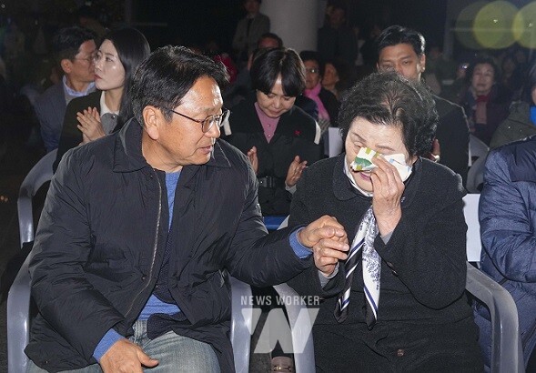강기정 광주광역시장이 11일 새벽 광주광역시청 시민홀에서 열린 '한강 작가 노벨문학상 수상기념 시민 축하행사'에 참석해 인공지능으로 복원한 소설 '소년이 온다' 주인공 '동호'의 축하메시지를 시청하며 문재학 열사의 어머니 김길자씨를 위로 하고 있다.