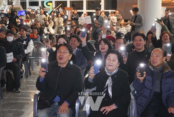 강기정 광주광역시장이 11일 새벽 광주광역시청 시민홀에서 열린 '한강 작가 노벨문학상 수상기념 시민 축하행사'에서 참석자들과 축하 세리머니를 하고 있다./광주광역시 제공