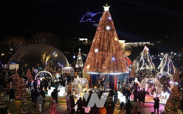 크리스마스 당일 함평 겨울밤 빛축제에서 중앙광장을 가득 채운 화려한 조형물과 조명 아래 수많은 방문객들이 따뜻한 연말 분위기를 만끽하고 있다
