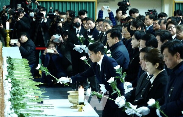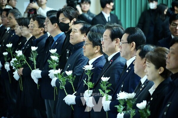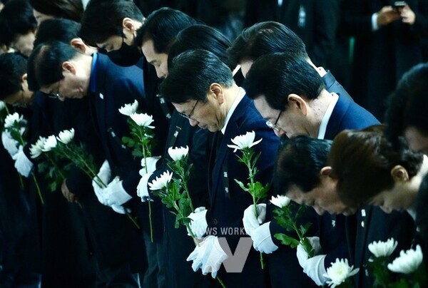 강기정 광주광역시장이 30일 오전 전남 무안군 무안종합스포츠파크에 마련된 ‘제주항공 여객기 참사 합동분향소’에서 이재명 더불어민주당 대표 등 민주당 지도부들과 함께 참배하고 있다. /광주광역시 제공