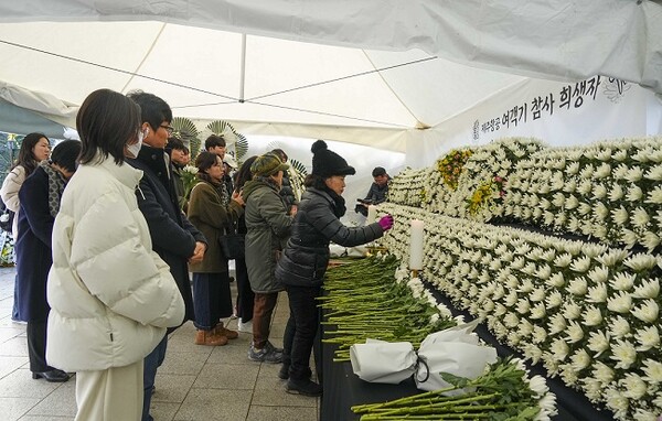 30일 오후 동구 5·18민주광장에 마련된 ‘제주항공 여객기 참사 희생자 합동분향소’를 찾은 시민들이 희생자들을 추모하고 있다./광주광역시 제공