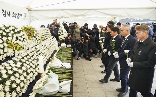 강기정 광주광역시장이 30일 오후 동구 5·18민주광장에 마련된 ‘제주항공 여객기 참사 희생자 합동분향소’를 찾아 광주지역 국회의원, 이정선 광주시교육감 등과 헌화하며 희생자들을 추모하고 있다./광주광역시 제공