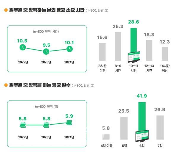 평균 작업 소요 시간은 10.1시간으로 전년대비 0.6시간 증가했으나, 한 회당 제작 일수는 6.3일로 전년대비 1.9일 줄었다.