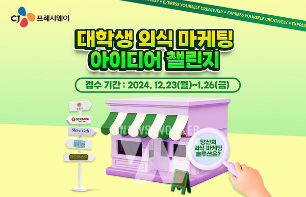 CJ프레시웨이가 대학생 대상 공모전 ‘외식 마케팅 아이디어 챌린지’를 실시한다. 외식 트렌드를 이끄는 학생들의 창의적인 아이디어를 바탕으로 외식 사업자의 고민을 해결을 돕는다는 취지다. 이번 공모전은 CJ프레시웨이의 식자재 고객사 △청년다방 △슬로우캘리 △복호두 △88포장마차 △호맥 이 함께 한다.
