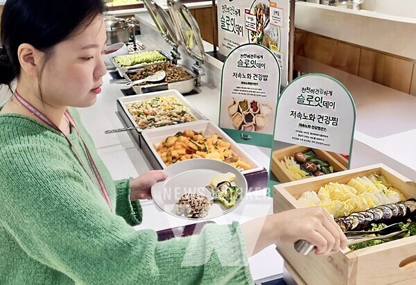 CJ프레시웨이는 지난달 26일 본사 급식장에서 첫 번째 슬로잇 데이를 운영하고 캠페인을 개시했다. 이날 메뉴는 △저속노화 건강밥 △저속노화 건강찜(채소찜) △통마늘 닭다리살 오븐구이 △매생이 달걀말이 △콩비지찌개 등으로 구성했다. 저속노화식 핵심 요소인 잡곡밥, 녹색 채소류, 콩·달걀·두부 등 고단백 식재료를 찌거나 굽는 방식으로 조리해 영양을 강화했다. 이와 함께 건강한 식사법을 안내하는 홍보물을 배포하고 구내식당 이용객 대상 현장 퀴즈 이벤트도 실시해 캠페인 효과를 극대화했다.